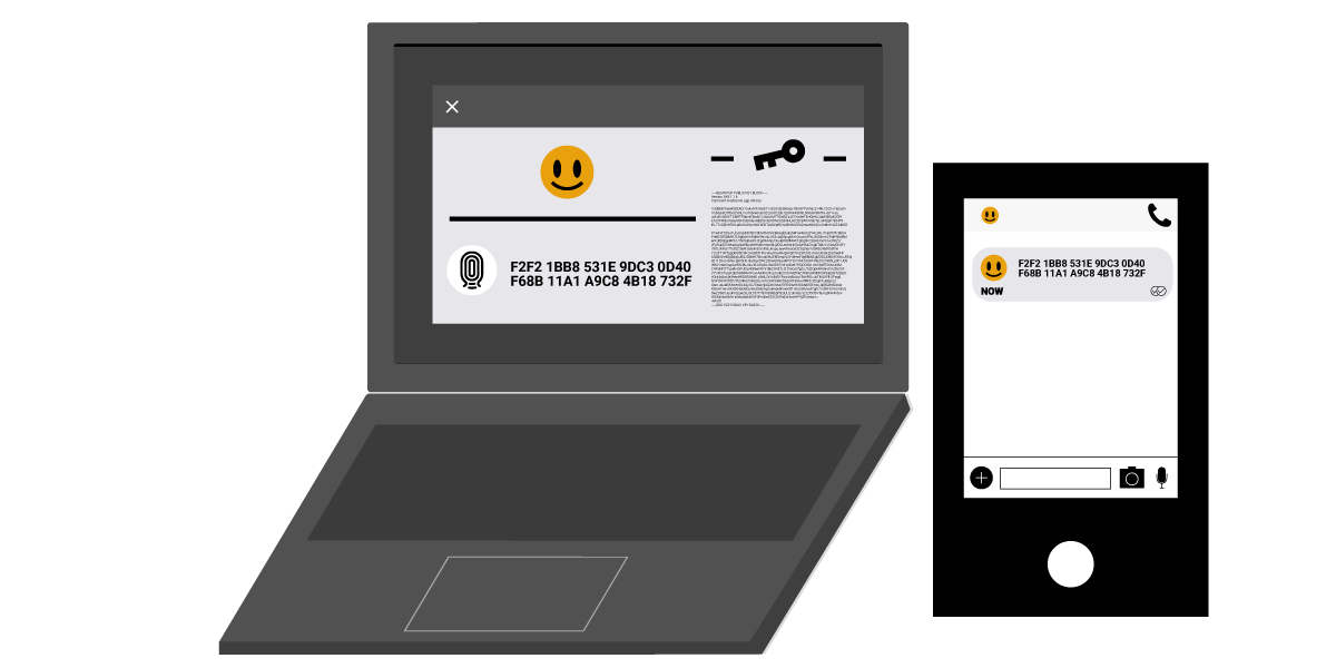ဘယ်ဘက်က လက်ပ်တော့မှာ PGP အများသုံးသော့၊ ကိန်းဂဏန်း ၄လုံးပါ ကိန်းစဉ် ၁၀ ခုတွဲနဲ့ အပြုံးမျက်နှာတို့ကို တွေ့ရပါမယ်။ ညာဘက်က စမတ်ဖုန်းမှာတော့ အတည်ပြုမယ့်နည်းလမ်း ဖြစ်တဲ့ Signal အက်ပ်ကိုဖွင့်ထားပြီး တူညီတဲ့ အပြုံးမျက်နှာနဲ့ ကိန်းဂဏန်း ၄ လုံးပါ ကိန်းစဉ် ၁၀ ခုတွဲကို တွေ့ရပါမယ်။ |